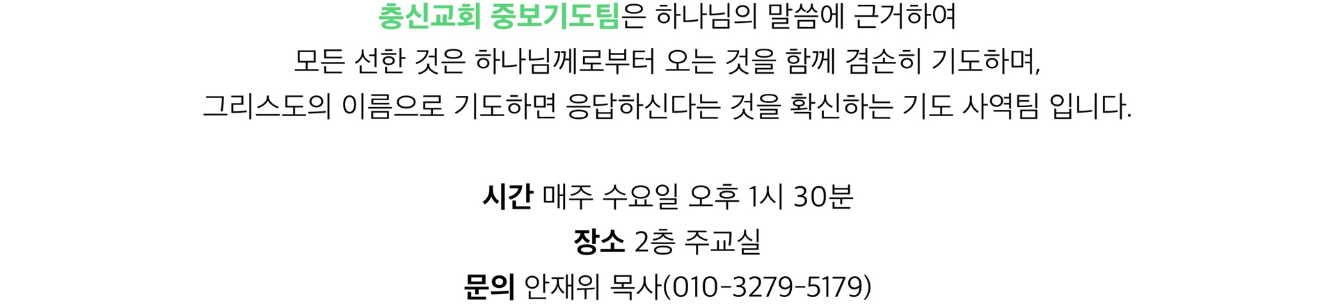 코로나19 사태로 인하여 [중보 기도회]는 잠시 방학합니다.